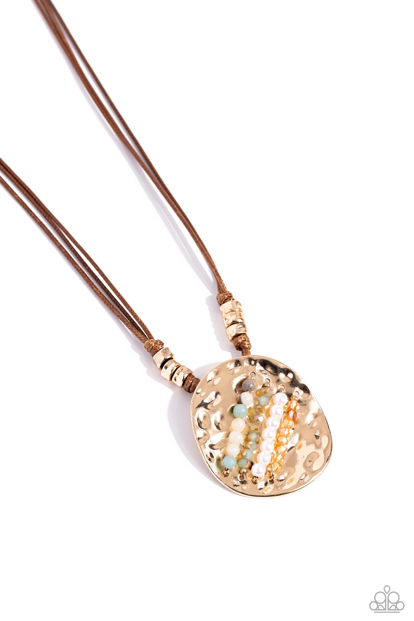 Elongated strips of brown cord, featuring infused gold accents, knot and loop through a hammered, concaved gold pendant. Row after row of multicolored stones, gold faceted beads, white pearls, and blue beads featuring a golden undertone are attached to the center of the hammered pendant, resulting in a colorfully rustic display. Features an adjustable clasp closure. As the stone elements in this piece are natural, some color variation is normal.