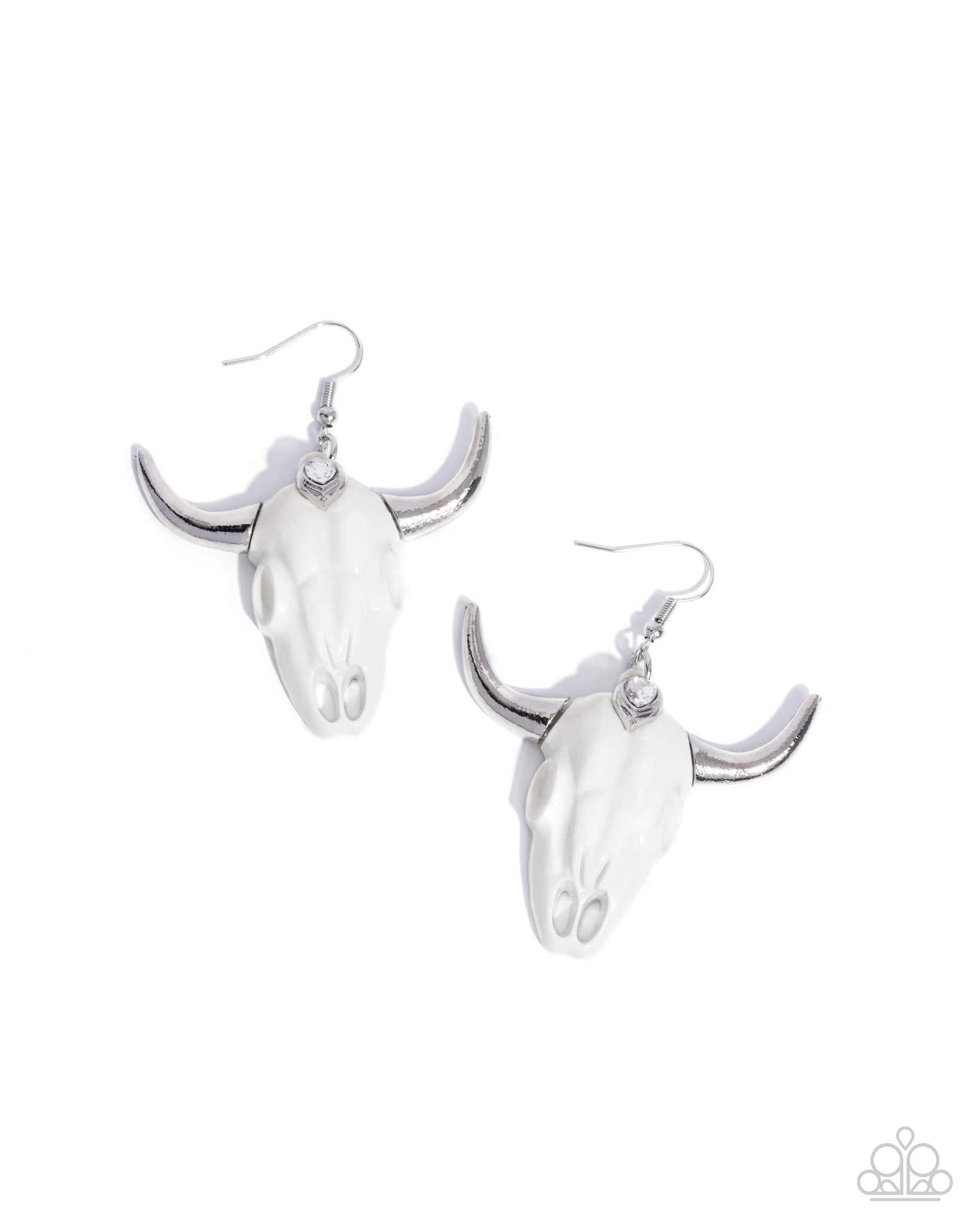 Featuring a solitaire white teardrop gem pressed in a silver fitting, a white bull skull with sleek silver horns sways below the ear for a rustic western look. Earring attaches to a standard fishhook fitting.